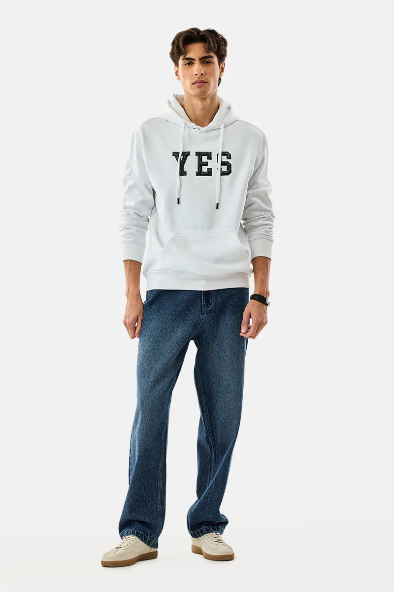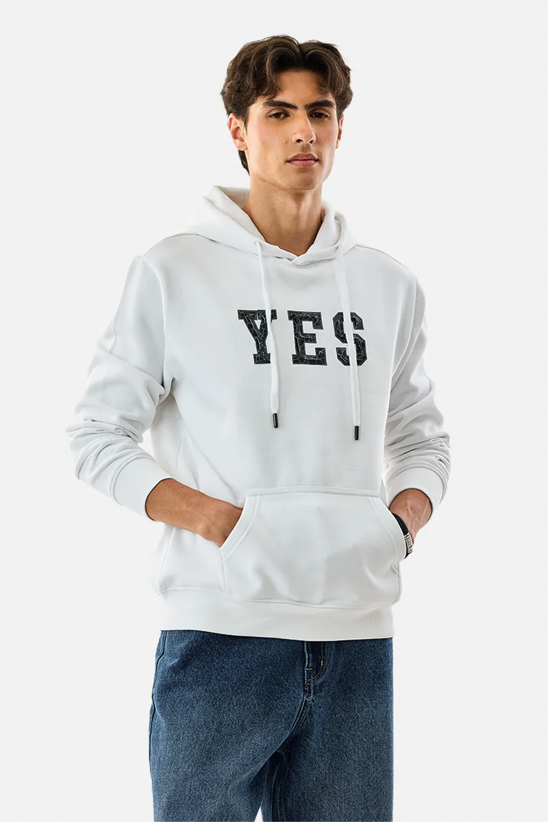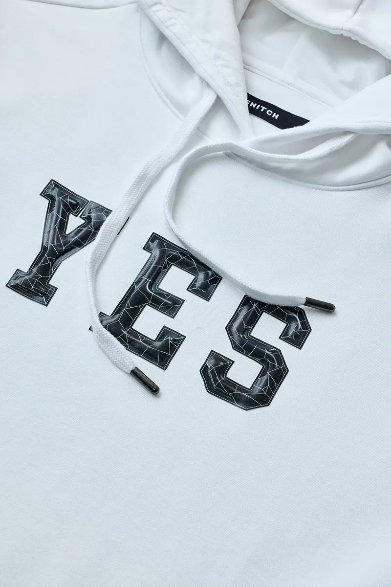 White Graphic Hoodie with YES Print – Cotton-Poly Blend Regular Fit Streetwear